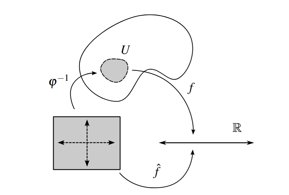 Coordinate representations turn a function on a manifold into a function on \(\mathbb R^N\). We will see that real valued functions and their coordinate representations play an important role in the theory of smooth manifolds, they are a natural test object to allow other objects to act upon. Note that if it is clear from context, we will often commit the mild sin of not distinguishing between \(f\) and its coordinate representation \(\hat f\) in order to clean notation.