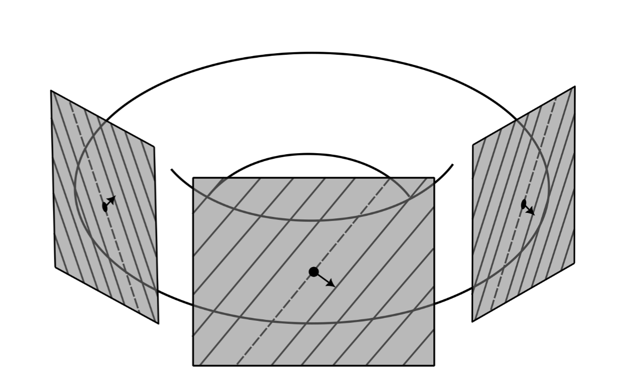 This is promising, but we still have a problem: the dot product does not have an immediate generalisation into our manifolds picture, as there isn't an obvious inner product to choose. These problems are signs that we shouldn't interpret the gradient of a function as a vector, but instead as some new object. Using this property of the gradient as a guide, we can see that the gradient of a function is an object that takes in a tangent vector, \(\gamma '(t)\), and returns a number, \(\frac{d}{dt} f(\gamma(t))\). Moreover, we should expect the gradient to be linear, as the dot product is also linear. These observations lead to the following definition. A covector at \(p\) is a linear map from the tangent space at \(p\) to \(\mathbb R\). Covectors can be visualised by the hyperplanes formed by their level sets on the tangent space. The value of a covector on a tangent vector can then be thought of as the number of these surfaces the tangent vector pierces.