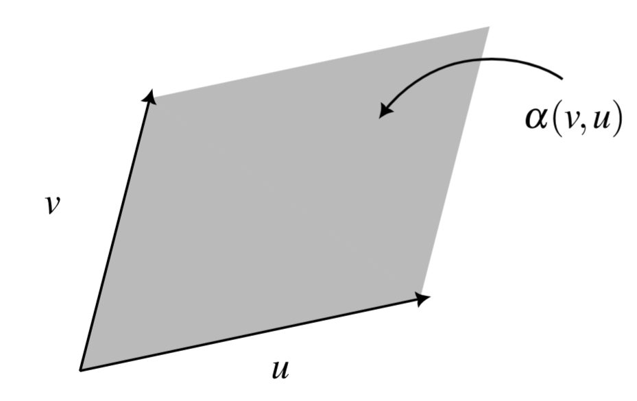 The first property reflects the fact that scaling a vector scales the total area that they span correspondingly. The second property corresponds to the fact that the area formed by a sum of vectors is simply the sum of the individual areas. A map which satisfies both of these is called a bilinear map, meaning that it is linear in both slots. The final property gives a way to encode the orientation of a span of vectors. A map satisfying this property is called anti-symmetric. Notice that the anti-symmetric property implies that \(\alpha(v, v) = 0\) for any tangent vector \(v\). In fact, if any two tangent vectors are parallel, meaning that they are scalar multiples of each other, then $$\alpha(\mu v, v) = \mu \alpha(v,v) = 0$$
