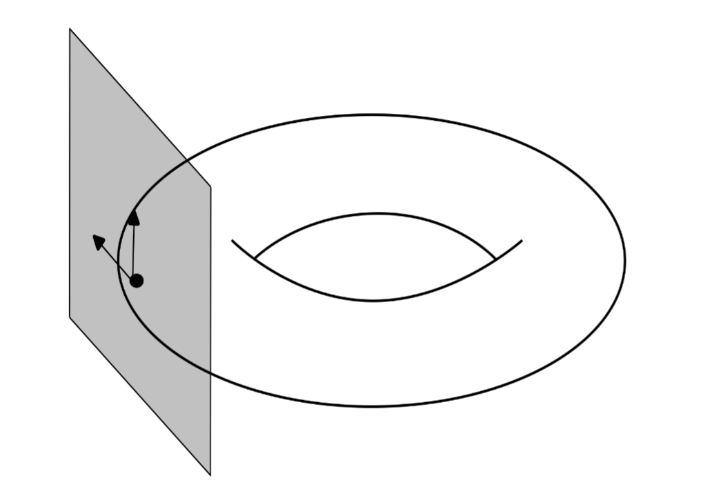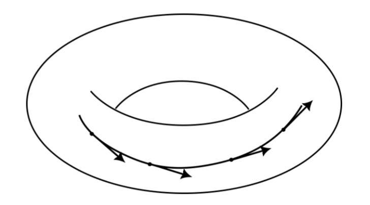 In classical mechanics, we are interested in understanding how a system evolves in time. At the most abstract level, this corresponds to finding a curve through phase space. Formally, a curve starting at \(p\) is a map \(\gamma\) from \(\mathbb R\) (or some interval in \(\mathbb R\)) to a manifold, such that \(\gamma(0) = p\). A helpful visualisation is to imagine a curve as tracing out a path along the manifold in time. Importantly, we can make sense of the derivative of a curve on a manifold: for each \(t \in \mathbb R\), the derivative of a curve defines a tangent vector \(\gamma'(t)\), such that $$\gamma'(t)(f)= \frac{d}{dt}f(\gamma(t))$$ where the right hand side is the usual ordinary derivative of a real valued function on the real line. Geometrically, the derivative of a curve defines the tangent to the curve.