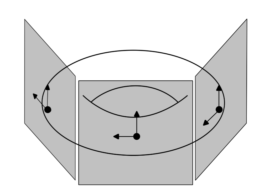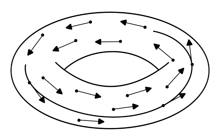 So far, this has all been defined pointwise, but we can extend this to a global definition. The idea is to take a special type of union of tangent spaces over all points on the manifold in a way that we "don't forget" the point which the tangent space is attached. Formally, this is done by taking the disjoint union of all the tangent spaces over each point \(p\) on the manifold. This new space is called the tangent bundle, and it consists of pairs \((p, v)\), where \(p\) is a point on the manifold, and \(v\) is a tangent vector at \(p\). Nonetheless, we will often treat elements of the tangent bundle as if they are simply tangent vectors. Formally, we are identifying a tangent vector \(v\) with it's image under the map \(v \mapsto (p, v)\).
