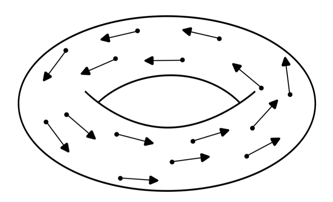Formally, a vector field is a map from a manifold to its tangent bundle, such that each point \(p\) gets mapped to a tangent vector at \(p\). Geometrically, we view a vector field as a collection of tangent vectors attached to the surface of the manifold.