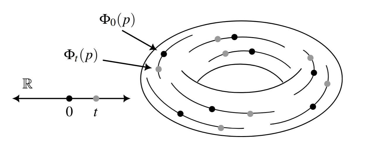 Formally, a continuous family of maps is a collection of maps \(\Phi_t\) from a manifold to itself, parameterised by a real number \(t\in \mathbb R\), such that for any point \(p\) on the manifold, and for any \(t, s \in \mathbb R\), $$\begin{align}