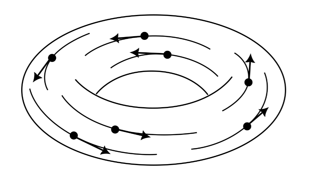 In symbols, we see that the infinitesimal generator \(X\) of \(\Phi_t\) is given by $$X_p = \Phi_0'(p)$$ Since integral curves are unique, and \(\Phi_t(p)\) is a curve starting at \(p\) which is tangent to \(X\) when \(t = 0\), it follows that \(\Phi_t(p)\) is the integral curve of \(X\) starting at \(p\). It is also possible to invert this process and get a continuous family of maps starting from a vector field. Imagine collecting up all the integral curves of a vector field, one starting at each point of the manifold. You could then track where all these points end up after flowing along their corresponding integral curve. This defines a continuous family of maps called the flow of the vector field. Explicitly, the flow \(\Phi_t\) of a vector field \(X\) is a continuous family of maps such that $$\Phi_t(p) = \gamma(t)$$ where \(\gamma\) is the integral curve of \(X\) starting at \(p\). Because a continuous family of maps corresponds to the integral curves of its infinitesimal generator, and the flow of a vector field is given by its integral curves, we see that continuous families of maps and the flow of their infinitesimal generator coincide. This result is so important that it is called the Fundamental Theorem on Flows.