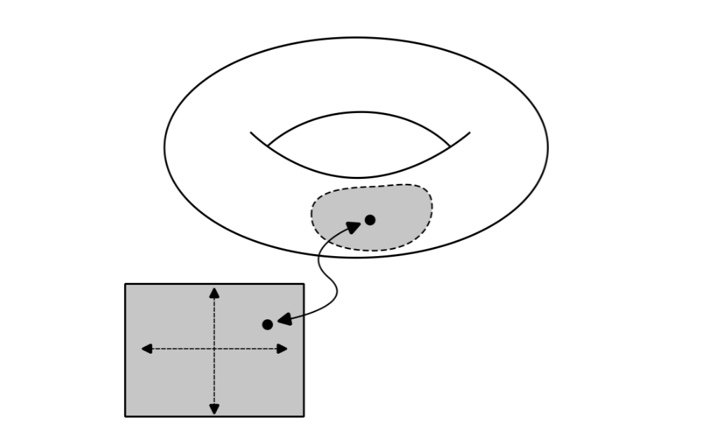 This pair, the neighbourhood and the map, is called a coordinate chart on the manifold. You can think of coordinate charts as providing a local coordinate system on the manifold, so that a point \(p\) within a given neighbourhood can be specified by a tuple called the coordinate representation of \(p\), given by $$\varphi(p) =(x_1(p), \dots, x_N(p))$$ It's important to emphasise that the point itself lives on the manifold and coordinates merely give us a useful way to identify the point. Note that there are a couple more technical conditions one needs to place on a manifold, but they are a bit too involved to discuss in detail here.
